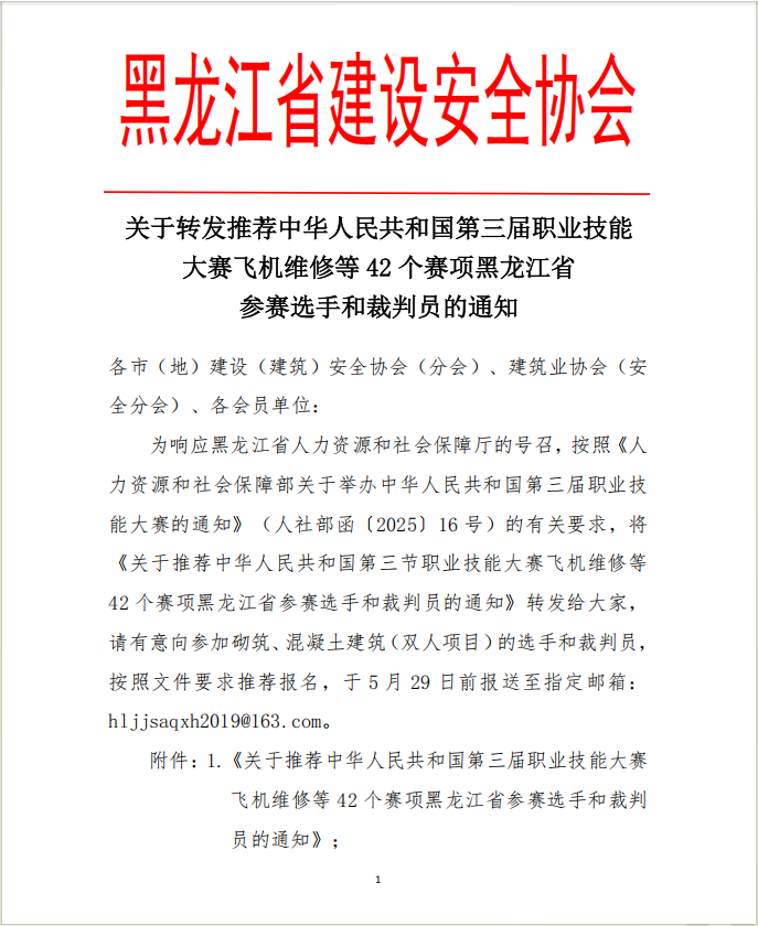 关于推荐中华人民共和国第三届职业技能大赛飞机维修等42个赛项黑龙江省参赛选手和裁判员的通知