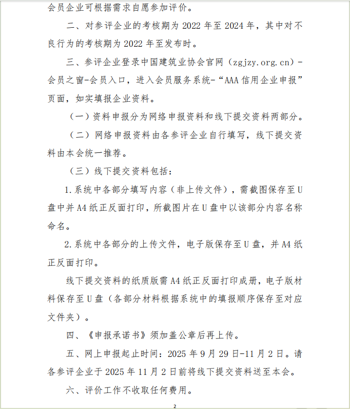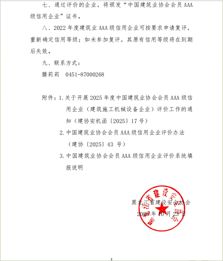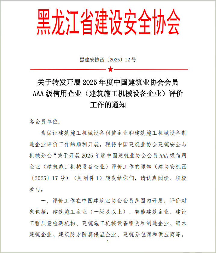 关于转发开展2025年度中国建筑业协会会员 AAA级信用企业(建筑施工机械设备企业)评价工作的通知(黑建安协函〔2025〕12号) 附件1.关于开展2025年度中国建筑业协会会员 AAA级信用企业(建筑施工机械设备企业)评价工作的通知(建协安机函〔2025〕17号) 附件2.中国建筑业协会会员AAA级信用企业评价办法(建协〔2025〕43 号) 附件3.中国建筑业协会会员AAA级信用企业评价系统填报说明