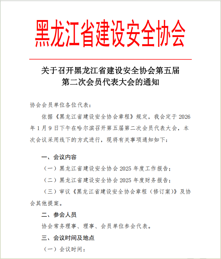关于召开黑龙江省建设安全协会第五届第二次会员代表大会的通知