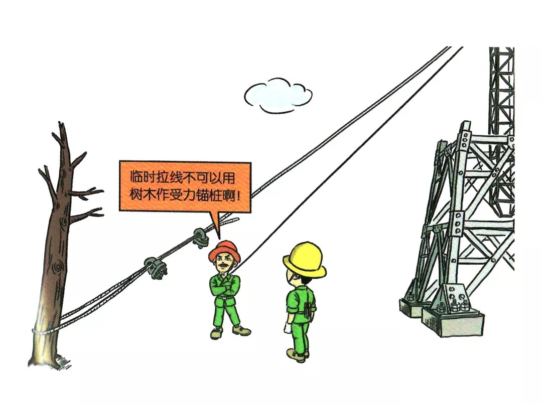 44.临时拉线用树木、岩石、杆塔等作受力锚桩
