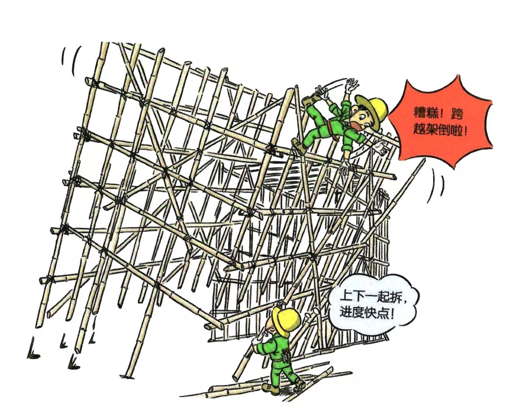 50.拆除跨越架时采用上下同时拆除或将架体整体推倒